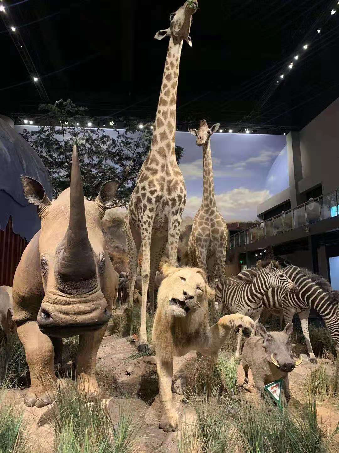 步入展厅,一场气势恢宏的野生动物大聚会,呈现在眼前。在广袤的非洲草原上,蓝天白云之下,视野忽然变得极为宽阔。在展厅里,你能看到不少动物泪眼婆娑,似乎在向人类诉说着无尽的遗憾和不幸,或许设计者正是通过这样一种形式,告诫人们,关爱野生动物,就是关爱同学们自己。看着这些原本可爱的生灵而今却只能在这里静止成为永恒,不能不感受到,人类必须要为自己的杀戮付出代价。
