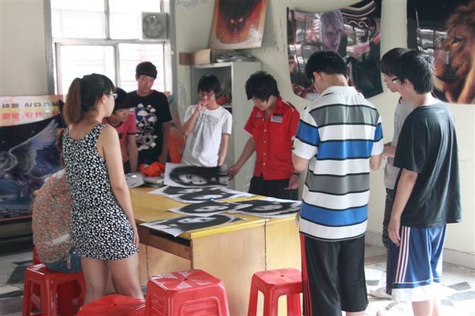 TT艺术彩绘工作室选拔2012级11名对彩绘工作有兴趣的学生由设计师冯铜带着实际项目手把手教学、系统培训、练习,技术达标后可跟随冯老师完成实际项目获得一定报酬,为成为专业的彩绘设计师不断提高,大三直接到彩绘相关企业实习、就业。