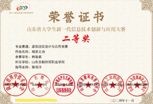 10月25日,第十六届山东省大学生科技节—山东省大学生新一代信息技术创新与应用大赛之虚拟现实设计与应用竞赛在山东电子职业技术学院成功举办。本次竞赛吸引了来自全省众多高校的80余支队伍积极参与,经过激烈角逐和层层筛选,最终34支精英团队脱颖而出,晋级决赛并进行了精彩的现场答辩。云商传媒学院韩瑜鑫在蔡海洋老师指导下,取得了二等奖的佳绩。