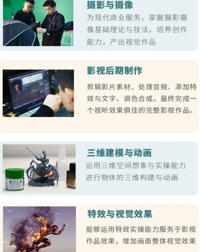 数字媒体技术面向软件和信息技术服务业以及广播、电视、电影和影视录音制作业等行业的计算机软件工程技术人员、技术编辑、音像电子出版物编辑、剪辑师、动画制作员等职业群。掌握扎实数字媒体专业知识和技术技能,具备从事内容编辑、视觉设计、创意设计、数字媒体应用开发等数字媒体产品设计制作实践能力的德、智、体、美、劳全面发展的高素质技术技能人才。