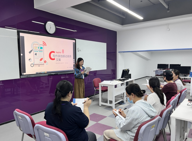 新教师王昕琳围绕《移动商务文案与写作》进行20分钟试讲,首先,回顾上节课第七章所学的重点内容,目的是帮助学生回忆前知、梳理思路、引入新知教学;其次,重点讲解了第八章海报文案写作的内容,包含海报文案重要性、海报文案组成、平台应用差异、海报结构设计、海报类型与排版等,教学中通过“618电商平台海报文案”案例拆解,引导学生思考,激发学生想可惜兴趣;最后,在课程设计中,课后拓展内容中王老师组织课后自主完成一则“618大促海报”预热文案的随堂练习。