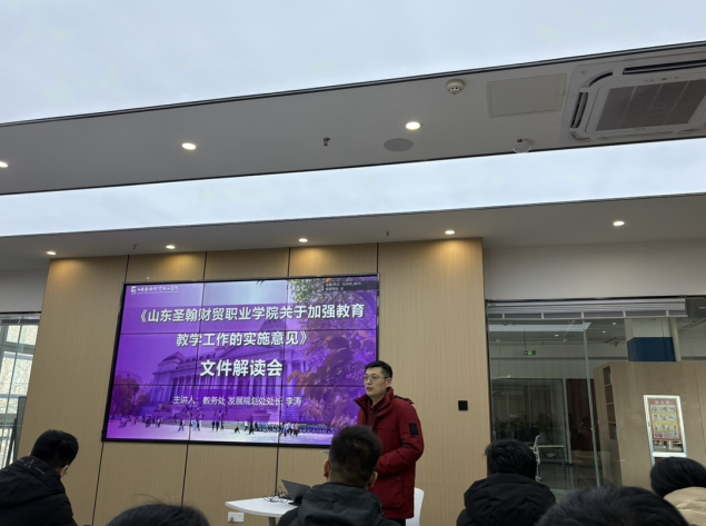 为深入学习贯彻学校教育教学改革精神,精准把握《山东圣翰财贸职业学院关于加强教育教学工作的实施意见》核心要义,切实提升学院教育教学质量与人才培养适配度,2026年1月20日,云商传媒学院教学管理科及数字媒体技术教研室、电商营销与直播教研室、新媒体运营教研室主任齐聚学校创梦空间路演室,参加教务处组织的文件解读会。