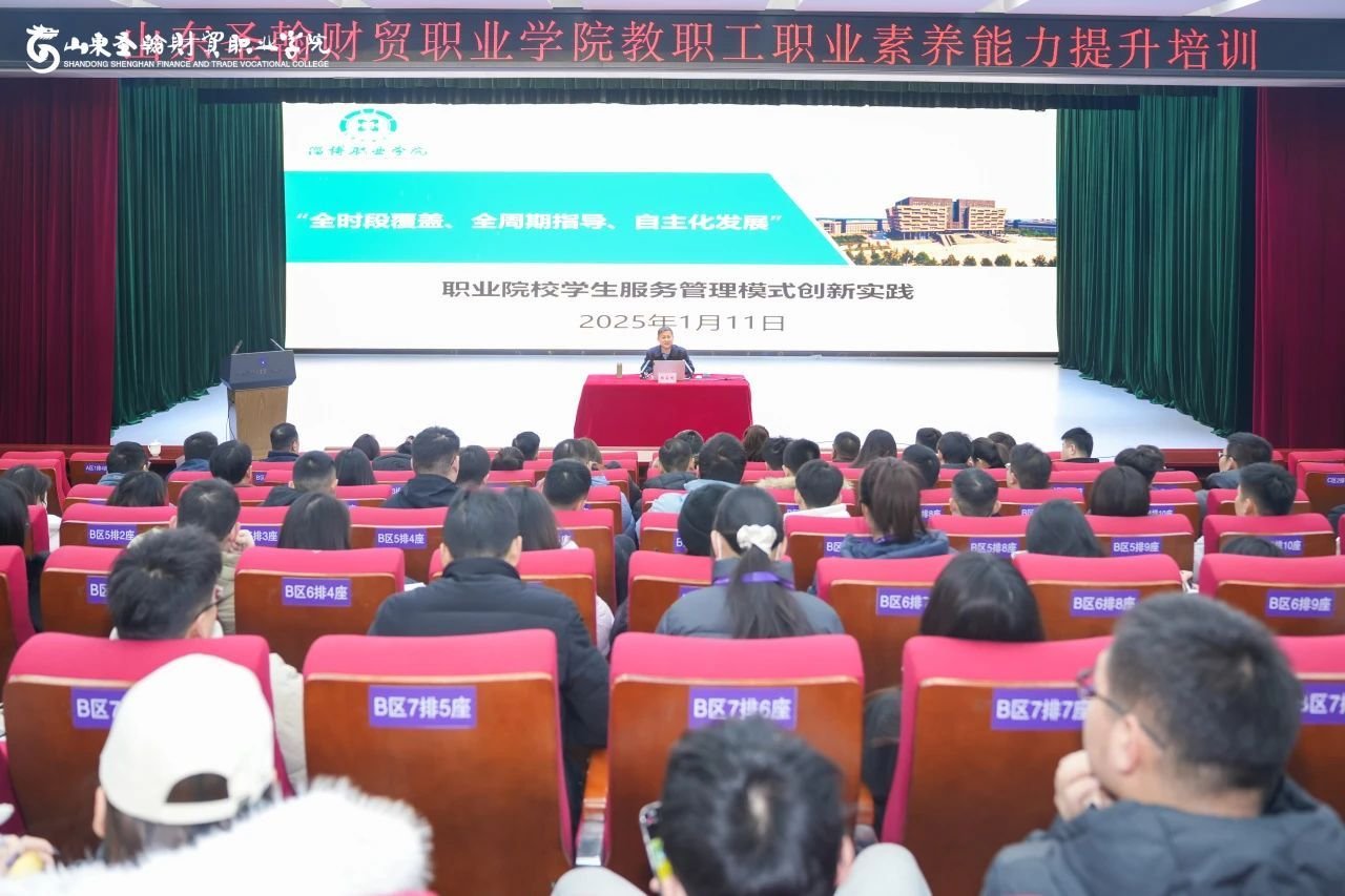 2025年1月11日,山东圣翰财贸职业学院在第二报告厅举办了题为“全时段覆盖、全周期指导、自主化发展”职业院校学生服务管理模式创新与实践专题讲座,由淄博职业学院学生工作处处长、国家二级心理咨询师郑家刚主讲,云商传媒学院学生管理人员及辅导员一起参加了此次讲座。讲座旨在提升教师对高职学生服务管理模式的认识,进一步推动学院教育质量的提升和学生自主发展的实现。