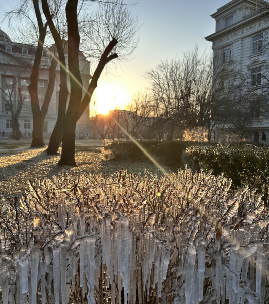 清晨的阳光穿透疏朗的枝丫,洒在校园的草木之上。一串串冰挂如水晶帘幕般垂落,在阳光折射下闪烁着细碎的金光,仿佛给冬日的校园披上了一层璀璨的银纱。遒劲的树木褪去了叶片的遮掩,枝干的轮廓在冰挂的映衬下更显苍劲,与远处典雅的欧式教学楼形成了刚与柔、冷与暖的巧妙碰撞。