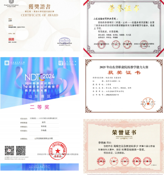 在教育教学与实践指导工作中,数字媒体技术专业教师带领学生参与一系列高水准赛事,其中包括山东省职业技能大赛、山东省大学生科技节相关赛项、山东省“技能兴鲁” 职业技能大赛相关赛项,以及NCDA全国高校数字艺术设计大赛等。在这些赛事舞台上,数字媒体技术专业的学生们凭借扎实的专业功底与创新精神,充分展现自我风采。经过激烈角逐,斩获省级一等奖10余项、二等奖30余项、三等奖超100项。这些荣誉不仅是对学生们努力与才华的高度认可,更是对我校数字媒体技术专业教学成果的有力彰显。
