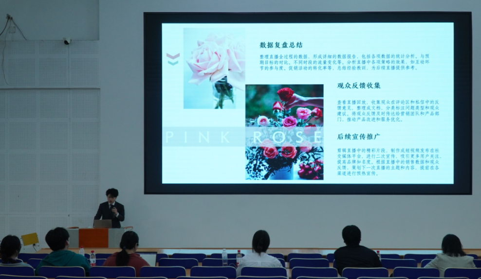 培训会上,参与项目的16个学生小组依次登台,通过PPT展示各个小组为“平阴玫瑰直播”设计的策划方案。同学们从产品定位、直播流程、引流策略、团队分工等角度展开阐述,充分展现了扎实的专业功底与创新思维。