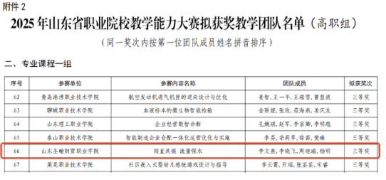 近日,山东省教育厅公示2025年山东省职业院校教学能力大赛获奖名单,山东圣翰财贸职业学院云商传媒学院李文燕、李晓飞、周晓瑜、杨明组成的教学团队获大赛(高职组)专业课程一组三等奖。