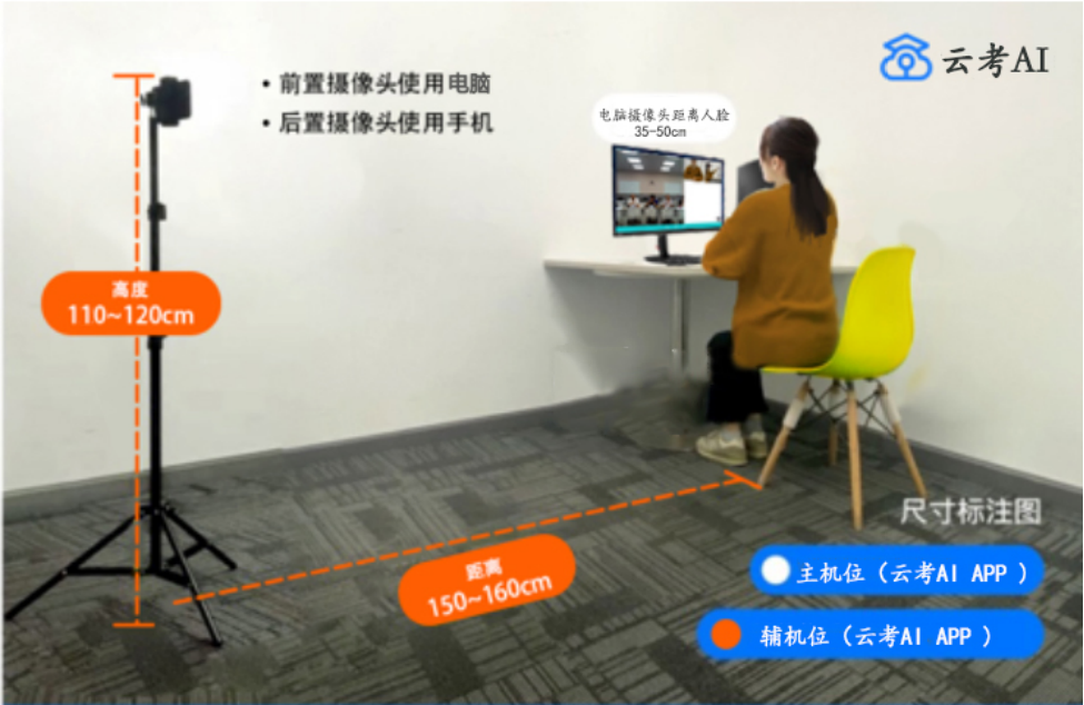 考试期间,第一机位用于直接考试答题(单招普通类考生线上系统内在线作答和单招退役军人类考生及综合评价考生线上面试),第一机位摄像头距离人脸30-50厘米,要能拍到考生本人人脸以及上半身;第二机位手机用于监考,该手机放在考生右后(或左后)上方(45度角)150厘米远处,手机位置高于桌面30-40CM(根据个人身高情况可适度调整),手机要横放,与水平面垂直。考生本人身体上半身和第一机位及草稿纸,必须完整的呈现在该手机的监控范围内。