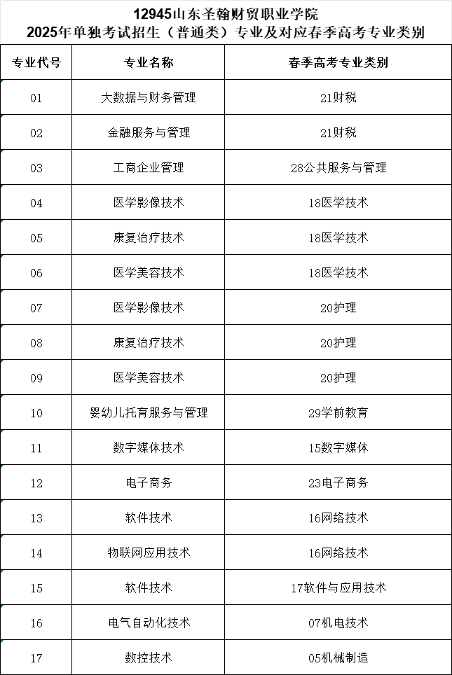 山东圣翰财贸职业学院2025年单独考试招生(普通类)专业及对应春季高考专业类别