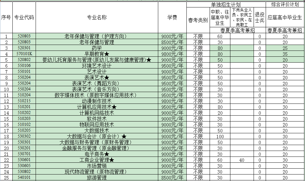 山东圣翰财贸职业学院2021年单招、综合评价招生专业设置表