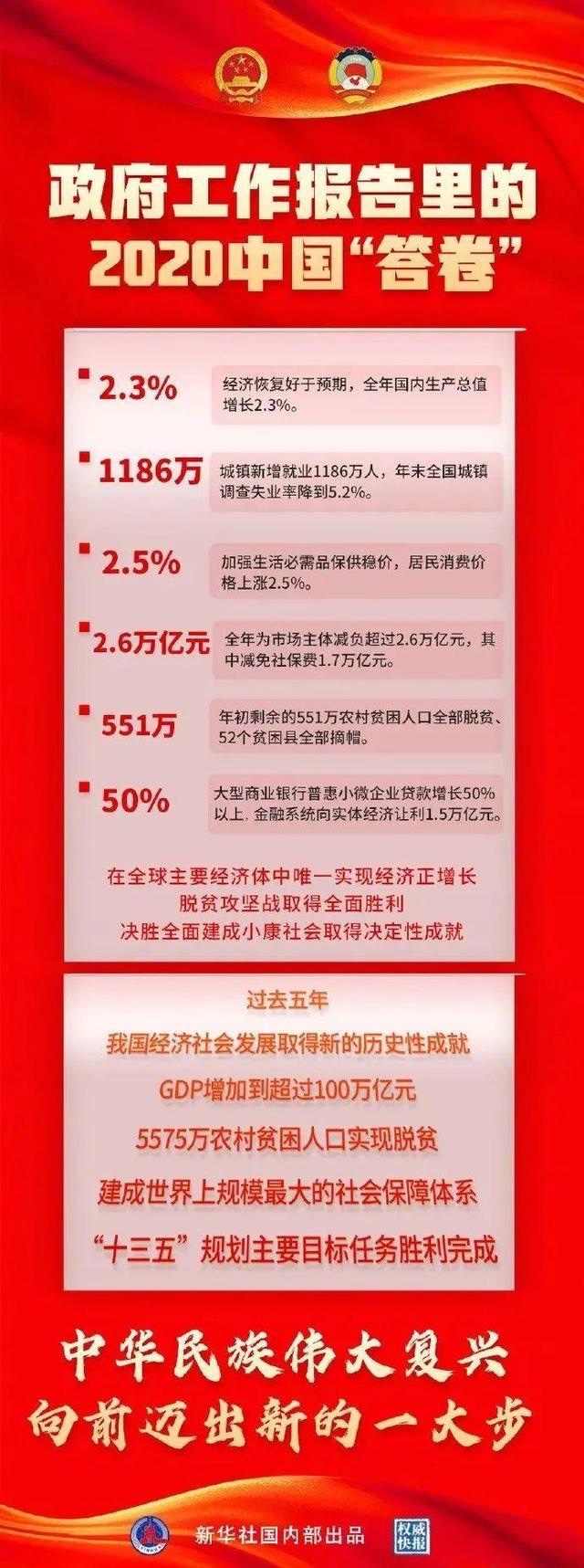 5日提请十三届全国人大四次会议审议的政府工作报告交出2020年中国“答卷”:全年国内生产总值增长2.3%、城镇新增就业1186万人、为市场主体减负超过2.6万亿元……极不平凡的2020年,全年发展主要目标任务较好完成,我国改革开放和社会主义现代化建设又取得新的重大进展。