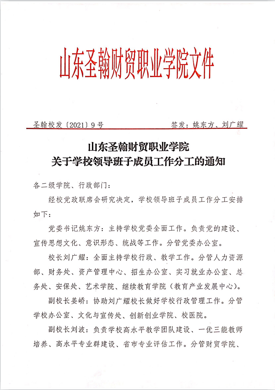 山东圣翰财贸职业学院关于学校领导班子成员分工的通知