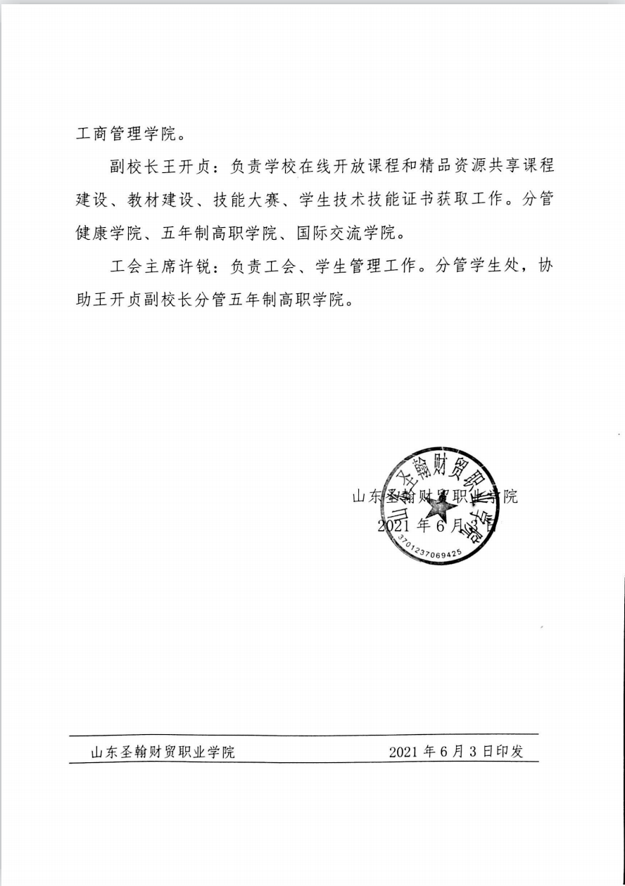 山东圣翰财贸职业学院关于学校领导班子成员分工的