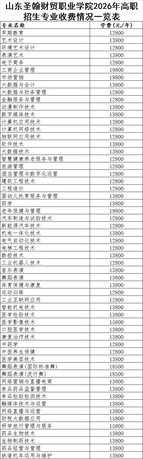 山东圣翰财贸职业学院2026年高职招生专业收费和住宿费情况一览表
