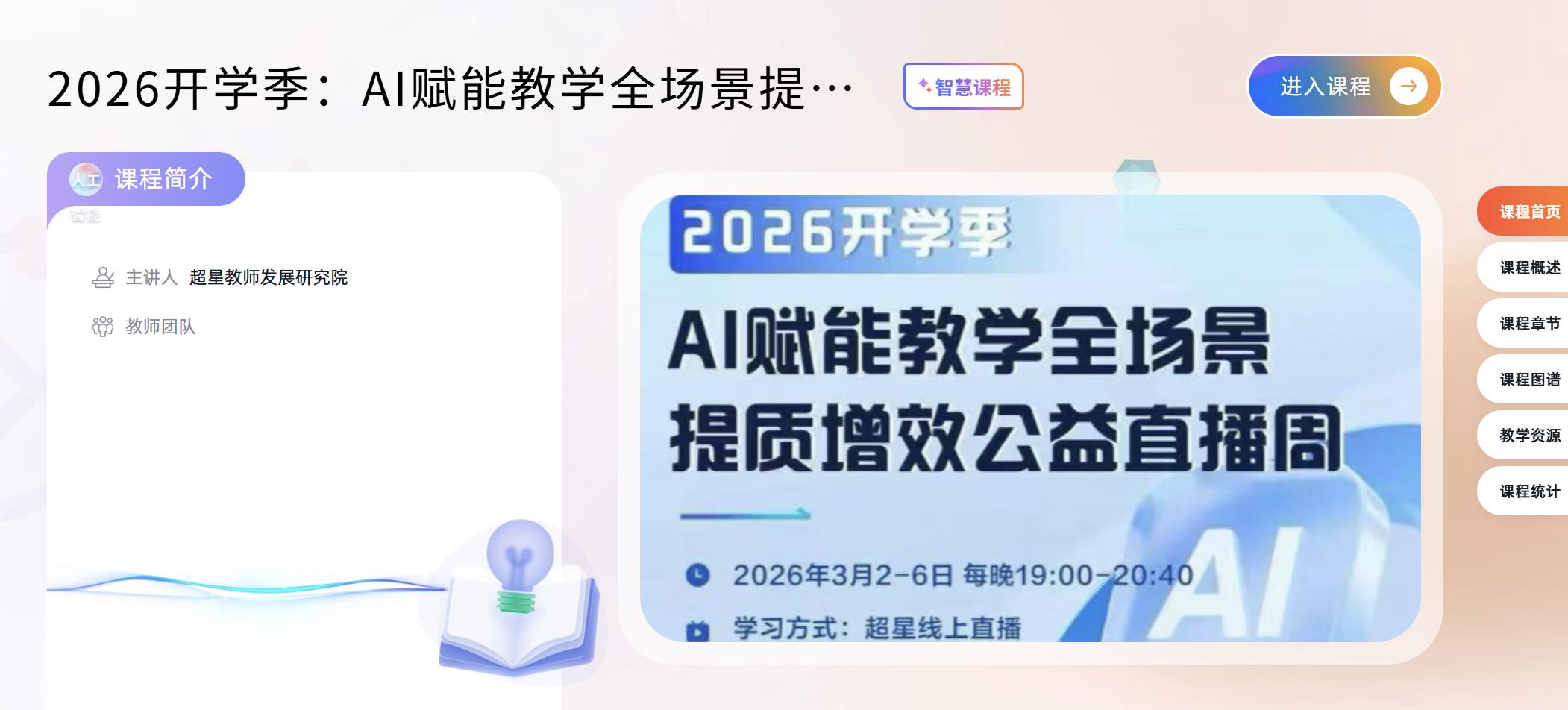 本次公益直播周活动主题为“智启师道 春育未来”。活动聚焦人工智能技术在教学全场景中的应用,旨在帮助广大教师掌握前沿教学工具,创新教学方法,提升课堂教学质量与效率。学习采用超星平台线上直播的方式进行,内容涵盖智能备课、课堂互动、学情分析等多个AI赋能教学实践环节,具有很强的实用性和前瞻性。