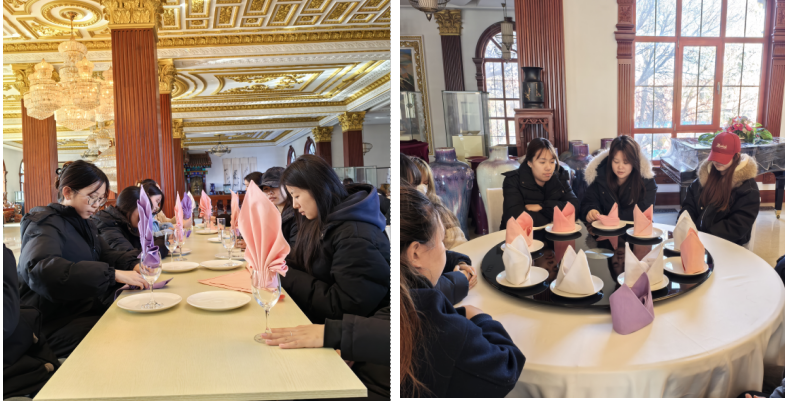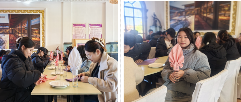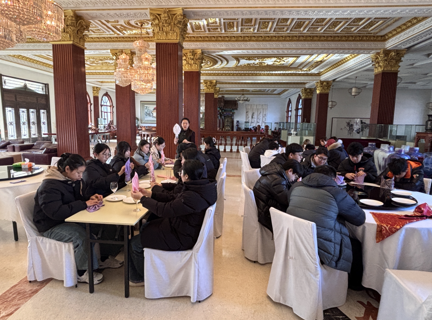 为夯实酒店管理与数字化运营专业服务基础,提升餐巾折花技能的熟练度与创意表现力,商学院于近日在府邸二楼实训室开展为期两周的餐巾折花项目实训。2024级酒店管理与数字化运营专业1.2班学生全员参与,以餐巾为材、以手法为技,在实操训练中打磨技能、提升素养。