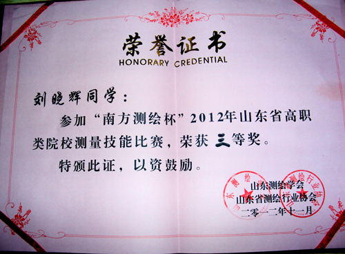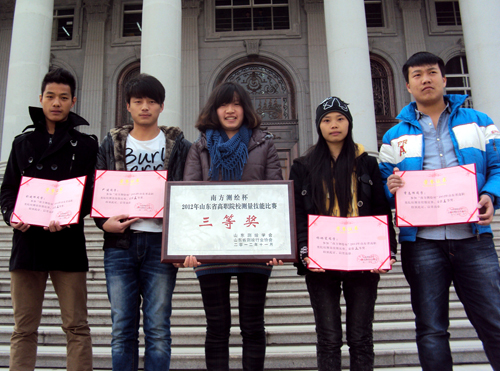 2012年11月16日,我校建筑工程学院学生常志辉、尹健、刘晓辉、杨琳斐等在孙翠老师的带领下参加了由山东测绘学会、山东省测绘行业协会、山东职业学院、广州南方测绘仪器有限公司济南分公司联合举办的“南方测绘杯”山东高职类院校测量技能大赛,并在本次中取得了三等奖的优异成绩。