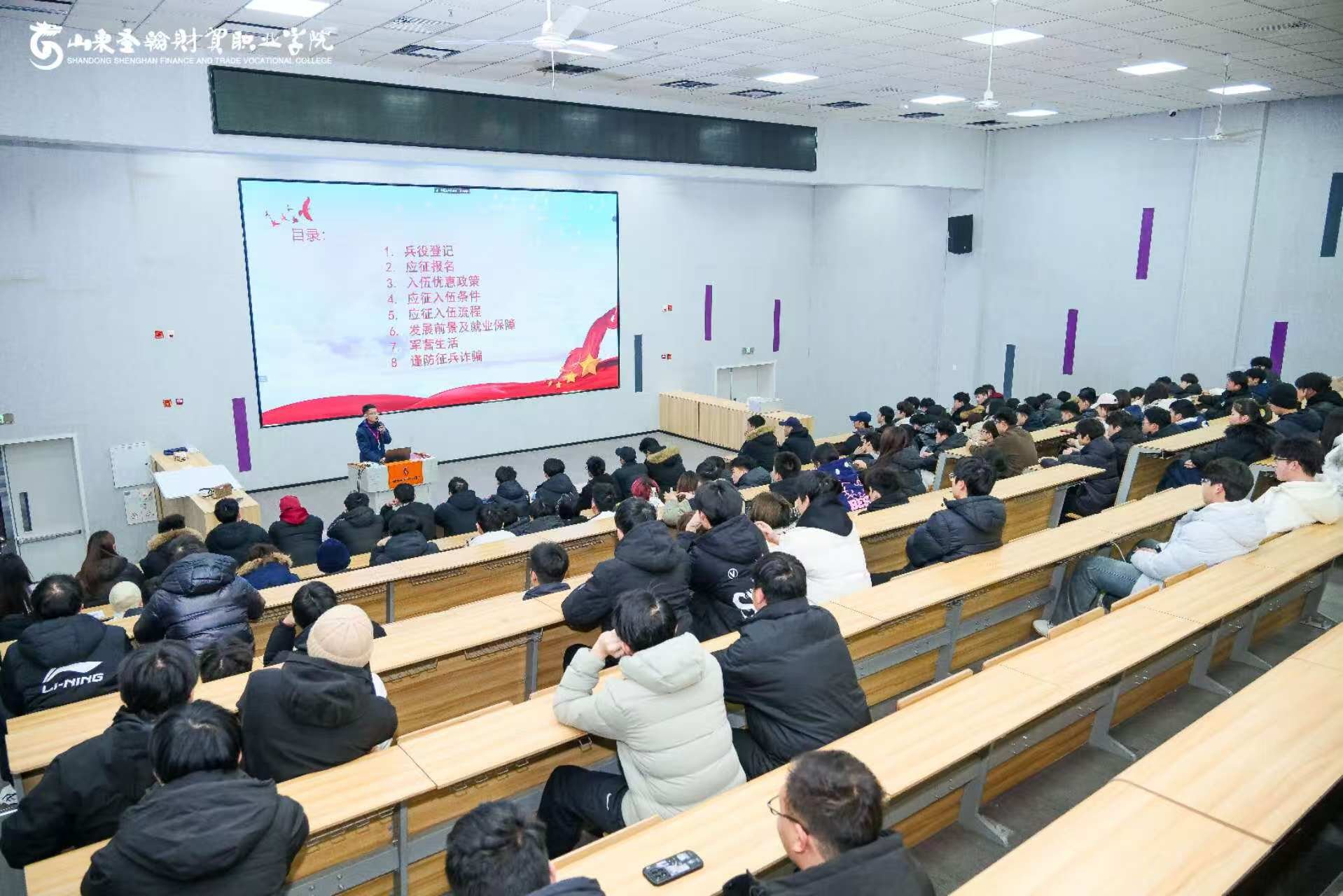 为深入贯彻上级征兵工作部署,激发青年学子爱国拥军、投身军营的热情,1月8日,山东圣翰财贸职业学院在吉纯楼第四报告厅召开2026年征兵政策讲解暨动员大会。学校团委、征兵工作站刘军凯担任主讲,各二级学院、校级组织学生代表及大三实习学生线上线下共300余人参加会议。