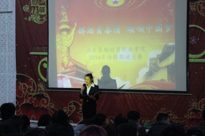 2014年12月17日下午16:00,山东圣翰财贸职业学院2014年诗歌朗诵大赛决赛在D5多媒体报告厅如期举行。本次大赛主要由校团委发起,经过两周的角逐,19位脱颖而出的同学站在今天决赛的舞台上。参加本次大赛的评委为各二级团委书记以及老师代表,并且荣幸的邀请到了赵雷校长。