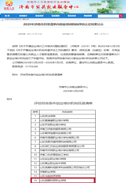 近日,济南市公共就业服务中心发布创业培训机构年度评估公示结果,山东圣翰财贸职业学院成功通过2025年度创业培训机构年度评估,顺利跻身符合条件的23家创业培训机构名单。这一成果,既是主管部门对学校创业培训工作质量与成效的充分认可,更是学校深耕创新创业人才培养的有力印证。
