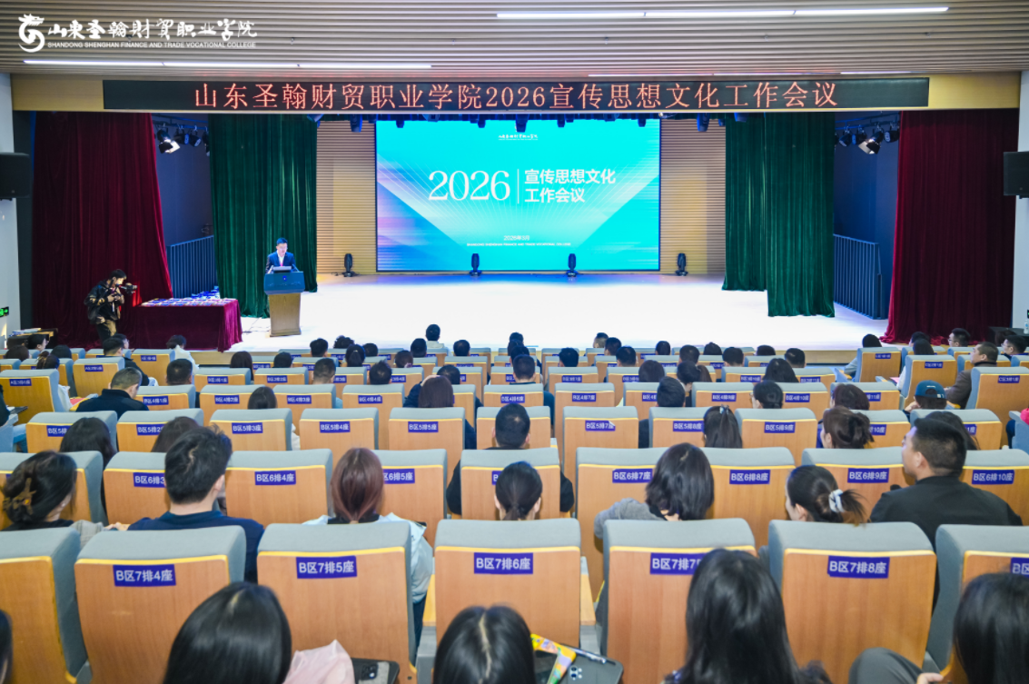 为全面贯彻落实上级宣传思想文化工作会议精神,系统总结2025年度工作成果,科学部署2026年重点任务,3月24日下午,山东圣翰财贸职业学院2026年宣传思想文化工作会议在学校第一报告厅召开。校长刘广耀,党委副书记、常务副校长姜峤,副校长阎磊,工会主席许锐出席会议,各二级学院、职能部门科级以上干部、宣传员及全体学管人员参加会议。会议由学校党委委员、党委宣传部部长张小宾主持。