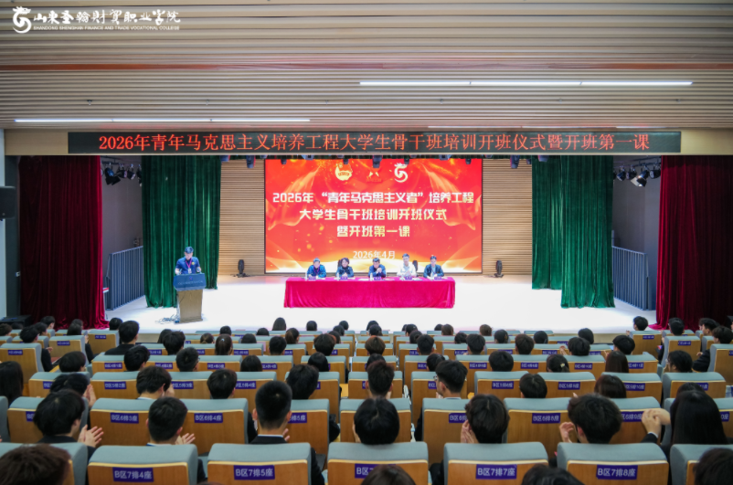 4月22日下午,山东圣翰财贸职业学院2026年“青年马克思主义者培养工程”大学生骨干培训班开班仪式暨开班第一课在吉纯楼第一报告厅举行。校领导、相关部门负责人出席活动。仪式由团委书记周光奇主持,