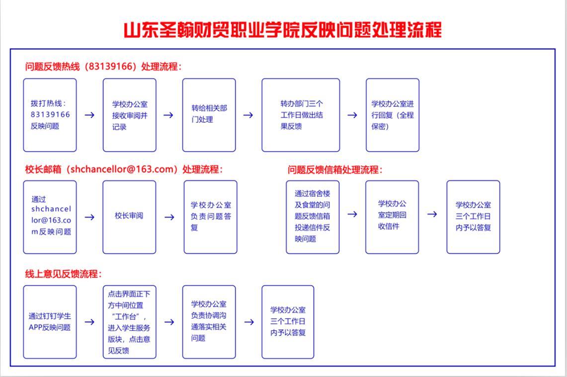 学校在学生钉钉系统界面开设线上意见反馈专区(登录学校钉钉学生APP,点击界面正下方中间位置“工作台”进入学生服务版块点击意见反馈),可通过此渠道向学校反映问题,学校办公室负责协调沟通落实相关问题处理意见并在三日内予以答复。