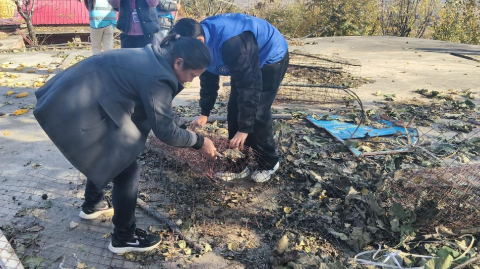 抵达五峰山脚下的农户庭院时,金灿灿的玉米堆满了晒场,志愿者们顾不上休整,迅速“变身”秋收帮手:有的弯腰清理晒场杂物,用工具将散落的玉米归整入仓;有的协助农户整理锈蚀的防护网,为粮食储存筑牢“安全屏障”;还有的帮着搬运秸秆、清扫落叶,让农家小院变得整洁利落。