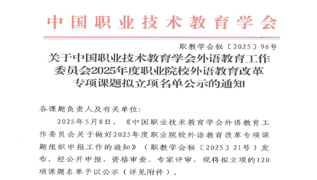 近日,中国职业技术教育学会公示了《关于外语教育工作委员会2025年度职业院校外语教育改革专项课题拟立项名单的通知》。山东圣翰财贸职业学院公共基础部教师申报的两项课题成功入选,展现了该部门在教学研究与学术创新方面的扎实积累。