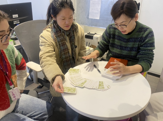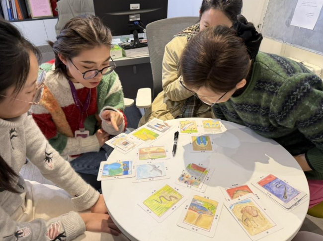 活动伊始,崔艳先通过破冰小游戏打破隔阂,引导辅导员们快速放松身心,随后详细讲解欧卡卡牌的使用方法与疗愈逻辑,鼓励大家抛开顾虑、随心选择卡牌。崔老师将欧卡卡牌摆放在圆桌之上,卡牌上的图像与文字交织出丰富的心理意象,涵盖“喜悦”“家”“孩童”“停止”等多元主题。在崔老师的专业引导下,辅导员们围坐圆桌,通过抽取、解读欧卡卡牌,结合自身工作与生活经历分享内心感受,在卡牌的意象联想与同伴的交流互动中,梳理情绪困扰,释放心理压力。过程中,大家时而专注思考卡牌寓意,时而彼此鼓掌交流,在轻松的氛围中完成了一场心灵的放松与疗愈。