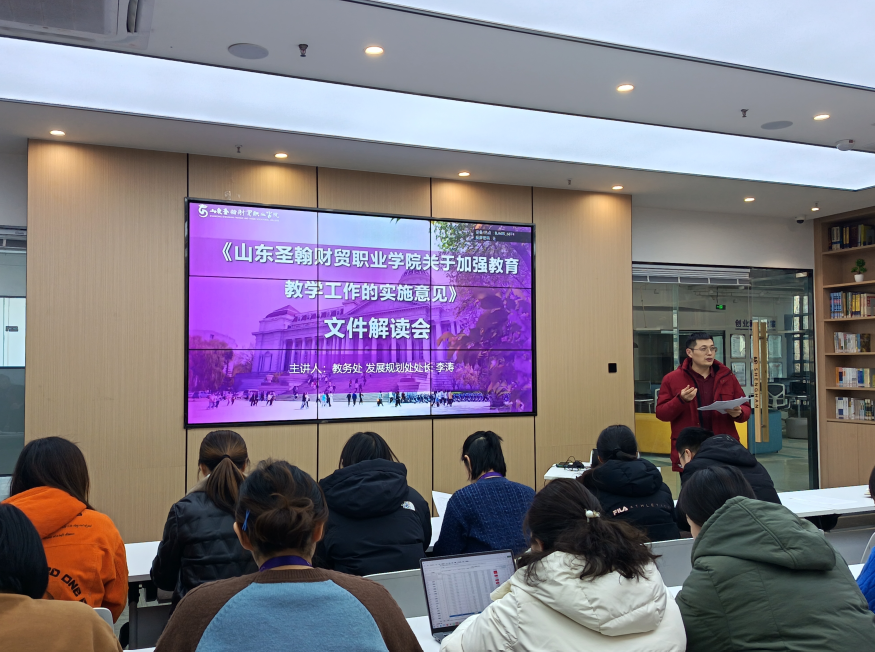 李涛从专业布局、专业群建设、课程体系重构、教学模式改革、产教融合深化等九个方面对文件进行了系统、深入、全面地解读。通过解读,与会人员深入理解了《实施意见》出台的背景、目标与战略意义,熟悉了文件各部分具体内涵和内在联系,明晰了在教育教学改革中的角色与责任,明确了今后一段时期学校教育教学工作的重点任务与实施路径。