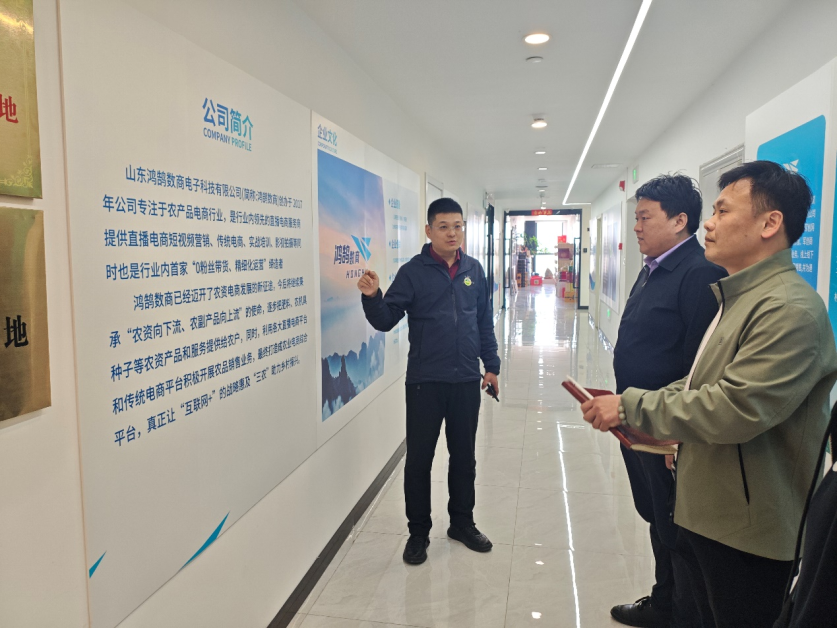 赵温兴对李学治一行的到来表示热烈欢迎,并详细介绍了山东鸿鹄数商电子科技有限公司的发展历程、业务布局及核心优势。该公司成立于2017年,以互联网技术为核心,深耕电子商务与农产品运营服务领域,涵盖传统电商、网红孵化、直播电商培训、货源供应链等全电商链条业务,同时聚焦乡村振兴,着力推动特色农产品数字化运营与品牌建设,在行业内积累了丰富的实践经验和优质资源,与学校云商传媒学院的专业发展方向高度契合。