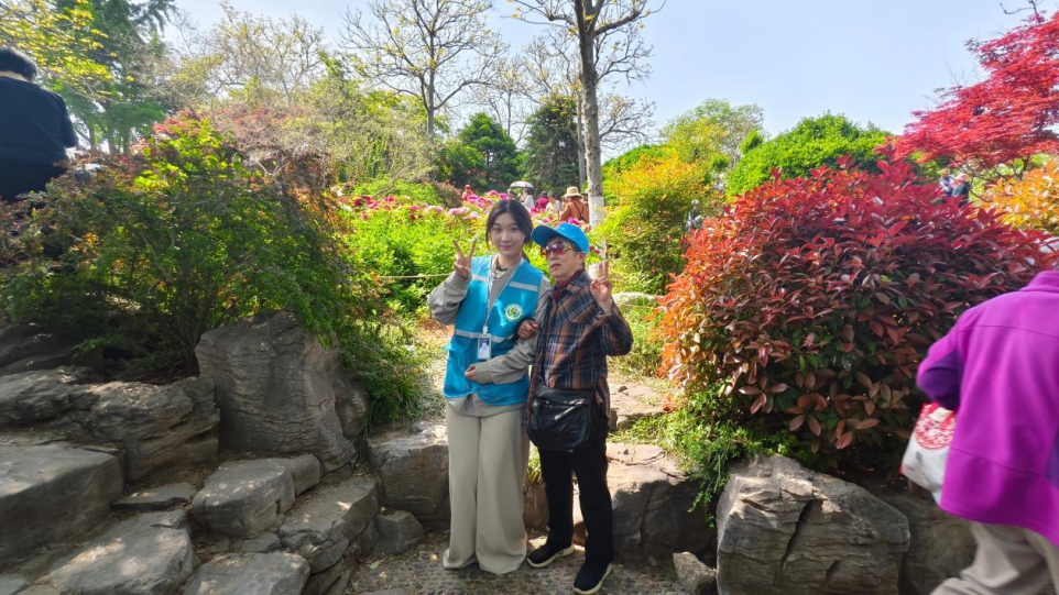 初到公园拍合照时,奶奶自觉“不好看”,悄悄躲到一旁。志愿者蹲身陪伴,一路搀扶,终于让她轻声说出:“你就是我的眼。”走进牡丹园,奶奶竟主动提出要合影,微微扬起嘴角,在繁花间定格下自信的笑容。