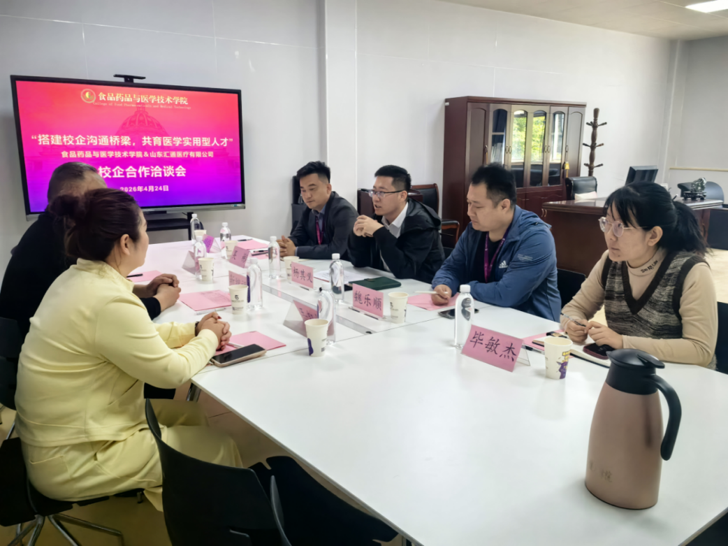 为深入推进产教融合、强化校企协同育人,精准对接医疗行业人才需求,破解人才培养与企业岗位脱节难题,4月24日,食品药品与医学技术学院与山东汇通医疗有限公司在专家办公室举行校企合作座谈会。山东汇通医疗有限公司总经理靳继福、法人代表王红娟,学院副院长杨其义、产教协同发展中心副主任魏乐顺、教学秘书吴彬及医学检验影像教研室主任毕敏杰共同参会,共绘合作发展蓝图。