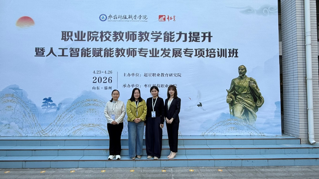 为深入贯彻落实《教育强国建设规划纲要(2024-2035年)》精神,积极响应山东省关于推动职业教育高质量发展及“人工智能+”行动的部署,切实提升教师的教学核心素养与数字化教学能力,2026年4月23日至26日,公共基础部副主任黄海英、商学院智慧财经教研室主任谢静、云商传媒学院新媒体运营教研室专职教师房昕宇、信息工程学院网络技术教研室专职教师王血融四位骨干教师,赴枣庄科技职业学院参加了“职业院校教师教学能力提升暨人工智能赋能教师专业发展”专项培训班。
