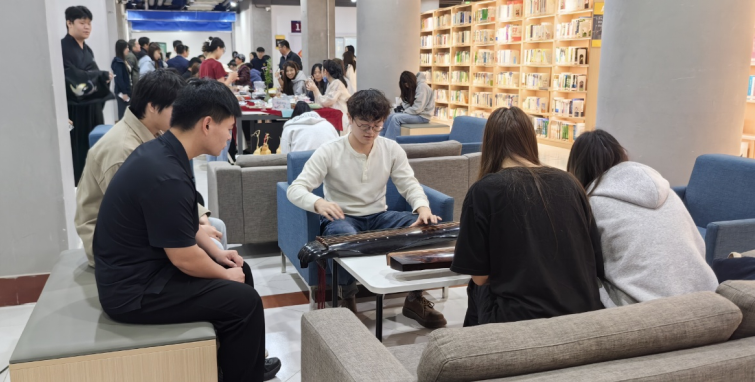 4月23日,在第31个世界读书日来临之际,山东圣翰财贸职业学院图书馆内书香氤氲、雅乐悠扬,由图书馆主办的“世界读书日”系列活动如期开展。公共基础部“一琴一品”古琴工作室积极参与,承担“弦音雅集”工作区相关工作,以琴韵伴书香,为活动增添了浓厚的传统文化氛围。