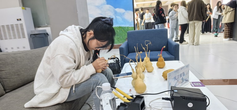 活动期间,“一琴一品”工作室成员不仅现场演奏了多首经典古琴曲目,悠扬琴声引得众多师生驻足聆听,还深入浅出地讲解了古琴的历史渊源与文化内涵,让同学们在书香中感受千年雅乐的魅力。值得一提的是,工作室特别推出了烙画葫芦非遗体验项目,吸引了大批同学踊跃参与。在工作室成员的指导下,同学们近距离了解了这一古老民间技艺的创作流程,并亲手尝试葫芦烙画,在实际操作中体会传统手工艺的精细与匠心。
