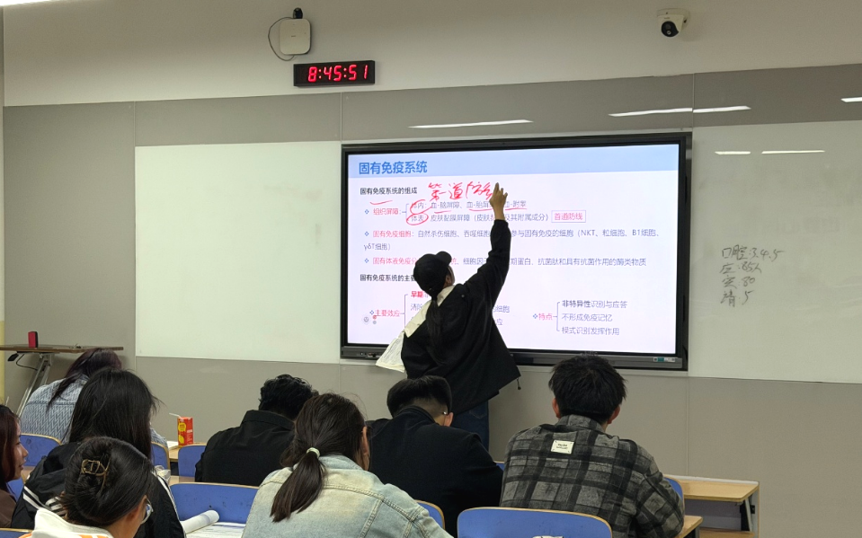 杨丹对展示进行了精准点评,既充分肯定了学生的自主学习成果和创新思维,也针对免疫应答发生机制等易错知识点及展示中的细节不足进行了细致讲解,引导全体学生深入思考、查漏补缺。在互动环节,同学们积极提问、热烈交流,围绕“口腔诊疗中如何利用免疫应答原理预防交叉感染”“免疫应答知识在口腔修复材料选择中的实践应用”等专业问题展开深入讨论。授课教师适时引导、耐心答疑,营造出“主动参与、乐于探究、勤于思考、互帮互学”的良好课堂氛围。