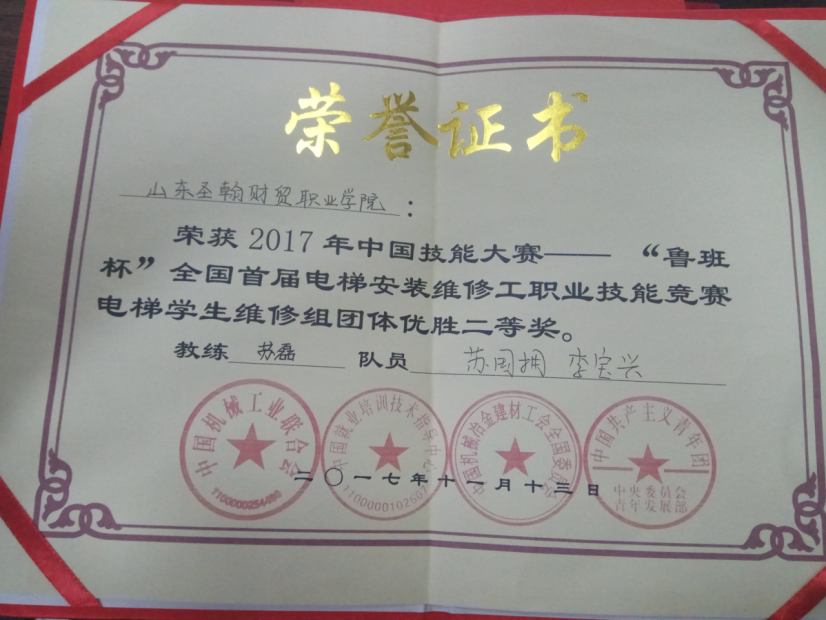 凭借过硬的综合技能与团队协作能力,他代表学校参赛,斩获2017年中国技能大赛——“鲁班杯”全国首届电梯安装维修工职业技能竞赛电梯学生维修组团体优胜二等奖,充分展现了我校学子精湛的专业技能与良好的职业素养。