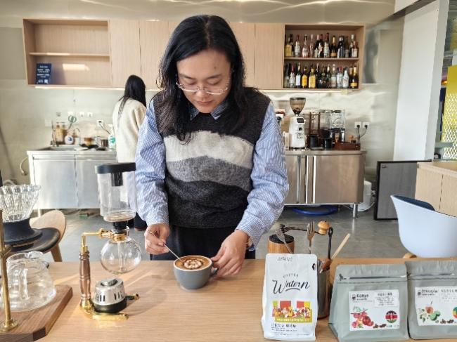 拉花艺术展示:要求教师在30秒内完成拿铁拉花,图案需兼具创意与对称性。教师周海玲以过硬的技术,通过奶泡与咖啡液的精准融合,在杯面勾勒出树叶纹路,引发现场观众阵阵惊叹。