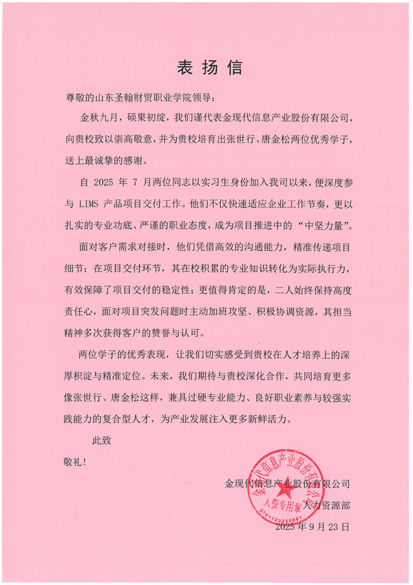 近日,金现代信息产业股份有限公司向山东圣翰财贸职业学院发来一封情真意切的表扬信,信中对我校信息工程学院的张世行、唐金松两位同学在实习期间的卓越表现给予了高度评价,并充分肯定了学校在人才培养和实习管理方面的显著成效。