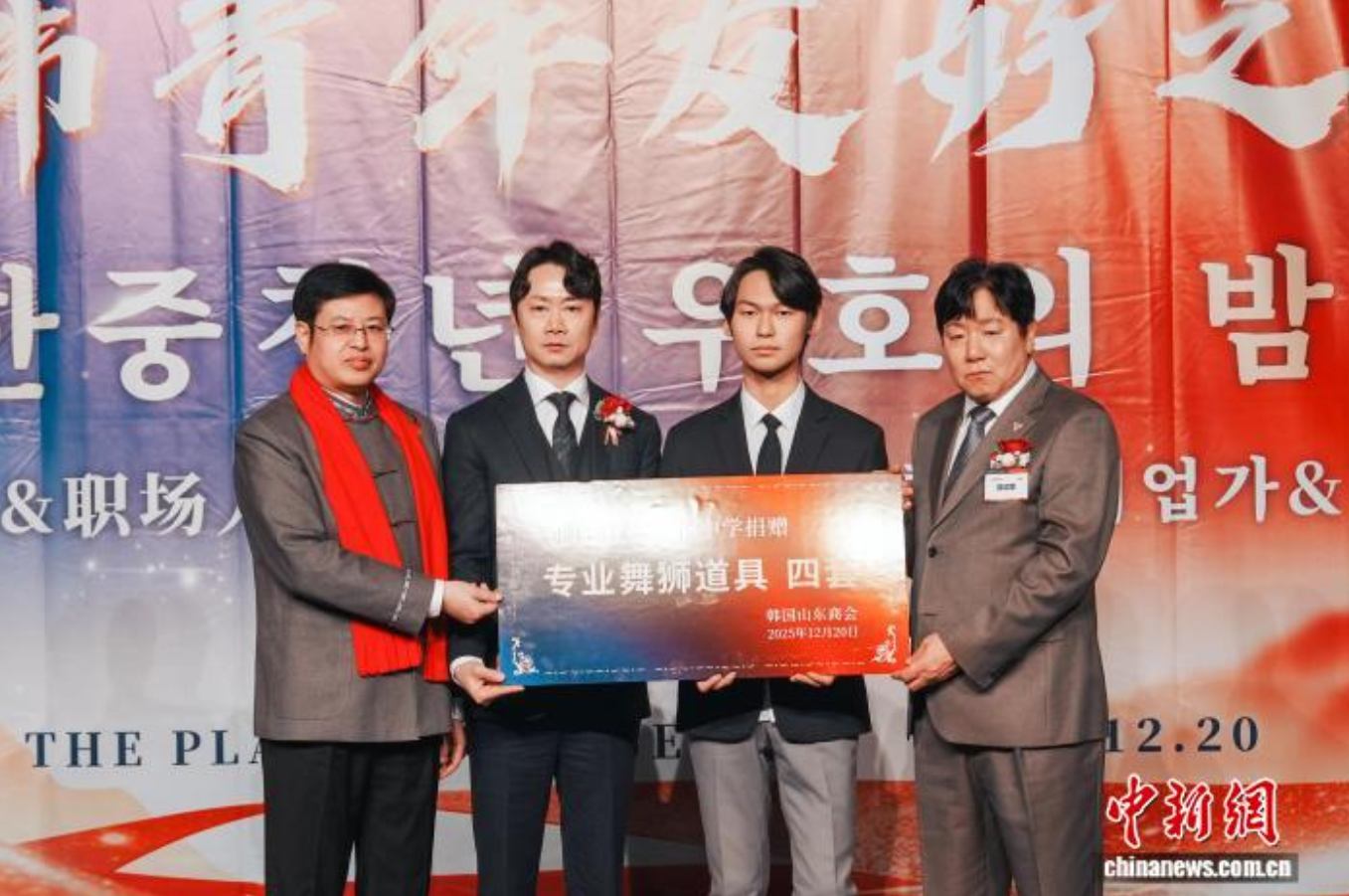 12月20日,2025中韩青年友好之夜在首尔举行。图为活动现场,韩国山东商会向韩国汉城华侨中学捐赠全新舞狮道具。韩国山东商会 供图