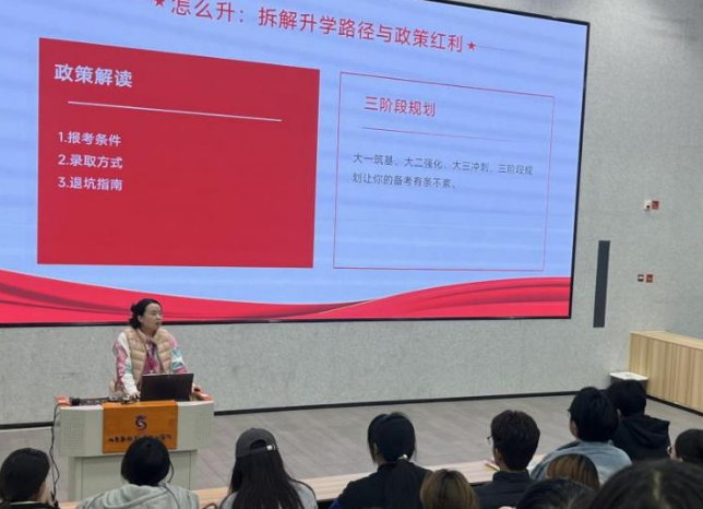 活动中,张红伟首先聚焦“为什么升”,深入剖析了专升本的战略价值。她从学历提升带来的经济回报切入,阐述了继续教育如何助力学生实现从“技术执行者”到“问题解决者”的能力跨越,并强调了升本后优质人脉资源带来的发展机遇。通过详实的数据与生动的实例,同学们对升学的意义有了更清晰的认知,进一步筑牢了升本的决心。