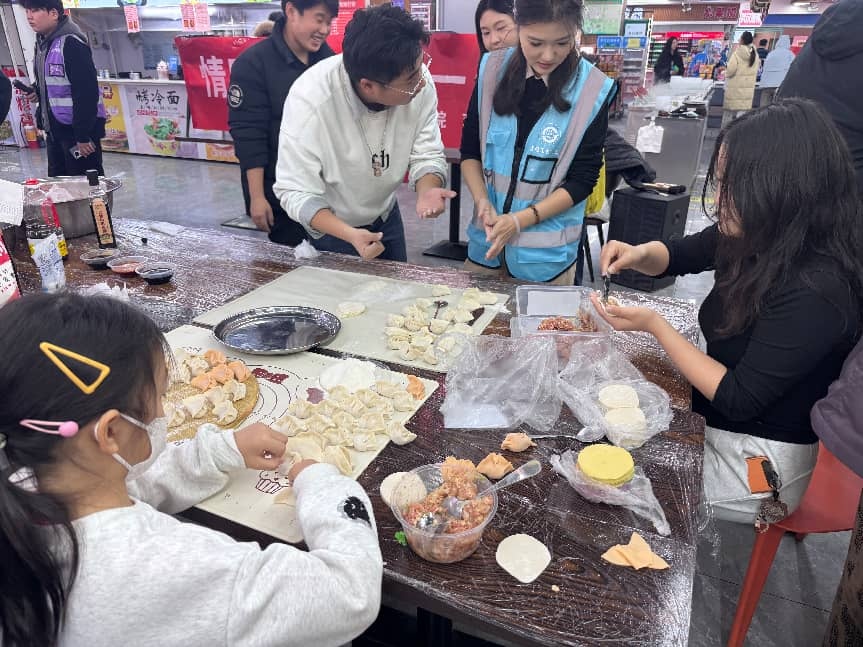 包饺子环节中,两院师生自由分组、分工协作,揉面、擀皮、包馅的过程里笑语不断。宣传部同学穿梭其间记录温馨瞬间,不少小组还创新出卡通造型、院系标识等特色饺子,最终“最具创意饺子奖”的评选让现场氛围愈发热烈。
