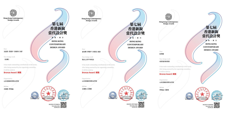 近日,第七届香港新锐当代设计奖获奖名单公布。云商传媒学院数字媒体技术教研室王春晓、李晓晶两位老师带领的学生团队表现亮眼,凭借多部原创视频与动画作品斩获三项铜奖,两位指导教师也同步荣获“优秀指导教师”,为学院再添荣誉。