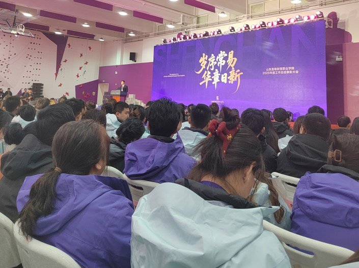 2026年1月30日上午,山东圣翰财贸职业学院2025年度工作总结表彰大会在吉纯楼第二体育馆举行,大会由党委副书记、常务副校长姜峤主持,云商传媒学院全体教师参加。