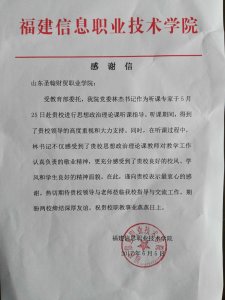 6月5日,福建信息职业技术学院针对此次听课,向我校专程发来《感谢信》。《感谢信》提到:听课过程中,林书记不仅感受到了我校思想政治理论课教师对教学工作认真负责的敬业精神,更充分感受到了我校良好的校风、学风和学生良好的精神风貌。对我校教育水平和办学条件给予了极大的肯定。