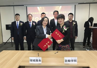 为贯彻落实《国务院办公厅关于深化产教融合的若干意见》,扎实打造“校企联合培养,入校即入职”的圣翰教育品牌,近日,山东圣翰财贸职业学院受邀前往绿城物业服务集团有限公司济南高新公司,参加“绿城物业高级经理班”校企签约仪式。济南绿城公司常务副总经理苏飞、综合管理部经理党小霞、山东圣翰财贸职业学院建筑工程学院院长伊爱焦、实训就业副院长金树凯、就业科长王圣文等8人参加了隆重的签约仪式。